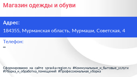 Магазин одежды и обуви по адресу 184355, Мурманская область, Мурмаши, Советская, 4 в дальнейшем Организация, размещена в следующих категориях: