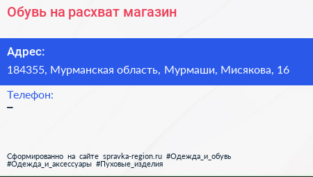 Обувь на расхват, магазин по адресу 184355, Мурманская область, Мурмаши, Мисякова, 16 в дальнейшем Организация, размещена в следующих категориях: