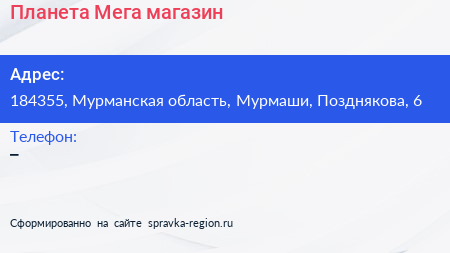 Планета Мега, магазин по адресу 184355, Мурманская область, Мурмаши, Позднякова, 6 в дальнейшем Организация, размещена в следующих категориях: