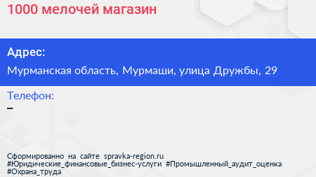1000 мелочей, магазин по адресу Мурманская область, Мурмаши, улица Дружбы, 29 в дальнейшем Организация, размещена в следующих категориях: