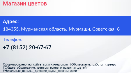 Магазин цветов по адресу 184355, Мурманская область, Мурмаши, Советская, 8 в дальнейшем Организация, размещена в следующих категориях:
