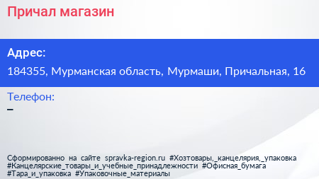 Причал, магазин по адресу 184355, Мурманская область, Мурмаши, Причальная, 16 в дальнейшем Организация, размещена в следующих категориях:
