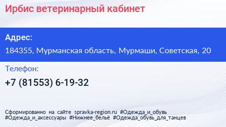 Ирбис, ветеринарный кабинет по адресу 184355, Мурманская область, Мурмаши, Советская, 20 в дальнейшем Организация, размещена в следующих категориях: