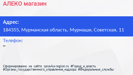 АЛЕКО, магазин по адресу 184355, Мурманская область, Мурмаши, Советская, 11 в дальнейшем Организация, размещена в следующих категориях: