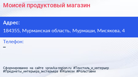 Моисей, продуктовый магазин по адресу 184355, Мурманская область, Мурмаши, Мисякова, 4 в дальнейшем Организация, размещена в следующих категориях: