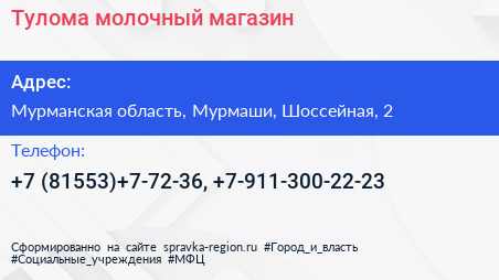 Тулома, молочный магазин по адресу Мурманская область, Мурмаши, Шоссейная, 2 в дальнейшем Организация, размещена в следующих категориях: