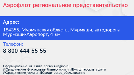 Аэрофлот, региональное представительство по адресу 184355, Мурманская область, Мурмаши, автодорога Мурмаши-Аэропорт, 4 км в дальнейшем Организация, размещена в следующих категориях: