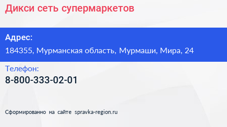 Дикси, сеть супермаркетов по адресу 184355, Мурманская область, Мурмаши, Мира, 24 в дальнейшем Организация, размещена в следующих категориях: