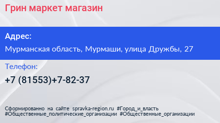 Грин-маркет, магазин по адресу Мурманская область, Мурмаши, улица Дружбы, 27 в дальнейшем Организация, размещена в следующих категориях: