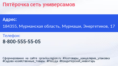 Пятёрочка, сеть универсамов по адресу 184355, Мурманская область, Мурмаши, Энергетиков, 17 в дальнейшем Организация, размещена в следующих категориях: