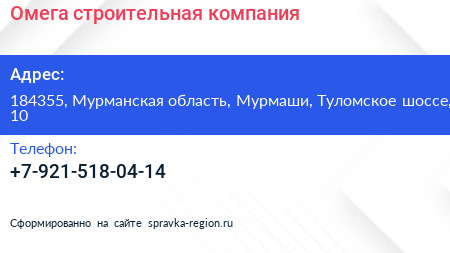 Омега, строительная компания по адресу 184355, Мурманская область, Мурмаши, Туломское шоссе, 10 в дальнейшем Организация, размещена в следующих категориях: