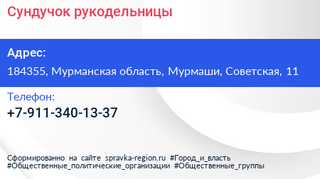 Сундучок рукодельницы по адресу 184355, Мурманская область, Мурмаши, Советская, 11 в дальнейшем Организация, размещена в следующих категориях: