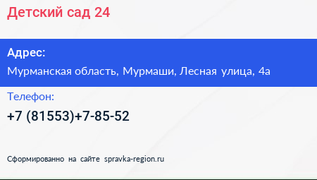 Детский сад №24 по адресу Мурманская область, Мурмаши, Лесная улица, 4а в дальнейшем Организация, размещена в следующих категориях: