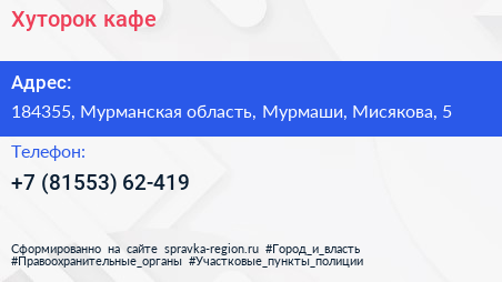 Хуторок, кафе по адресу 184355, Мурманская область, Мурмаши, Мисякова, 5 в дальнейшем Организация, размещена в следующих категориях: