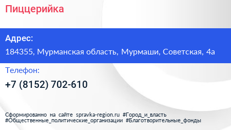 Пиццерийка по адресу 184355, Мурманская область, Мурмаши, Советская, 4а в дальнейшем Организация, размещена в следующих категориях: