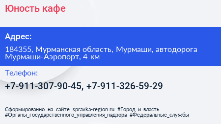 Юность, кафе по адресу 184355, Мурманская область, Мурмаши, автодорога Мурмаши-Аэропорт, 4 км в дальнейшем Организация, размещена в следующих категориях:
