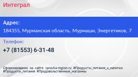 Интеграл по адресу 184355, Мурманская область, Мурмаши, Энергетиков, 7 в дальнейшем Организация, размещена в следующих категориях: