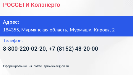 РОССЕТИ, Колэнерго по адресу 184355, Мурманская область, Мурмаши, Кирова, 2 в дальнейшем Организация, размещена в следующих категориях:
