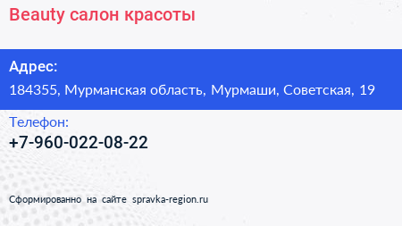 Beauty, салон красоты по адресу 184355, Мурманская область, Мурмаши, Советская, 19 в дальнейшем Организация, размещена в следующих категориях: