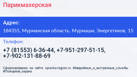 Парикмахерская по адресу 184355, Мурманская область, Мурмаши, Энергетиков, 15 в дальнейшем Организация, размещена в следующих категориях: