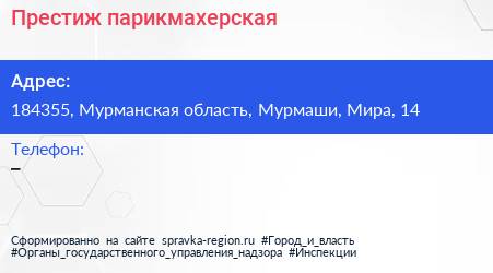 Престиж, парикмахерская по адресу 184355, Мурманская область, Мурмаши, Мира, 14 в дальнейшем Организация, размещена в следующих категориях: