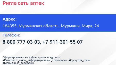 Ригла, сеть аптек по адресу 184355, Мурманская область, Мурмаши, Мира, 24 в дальнейшем Организация, размещена в следующих категориях: