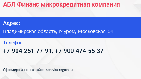 АБЛ-Финанс, микрокредитная компания по адресу Владимирская область, Муром, Московская, 54 в дальнейшем Организация, размещена в следующих категориях: