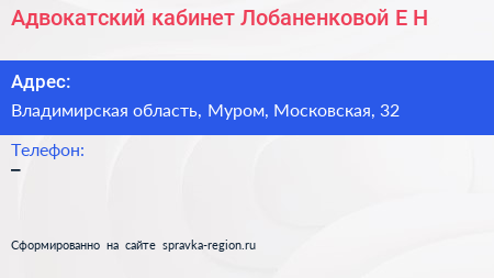 Адвокатский кабинет Лобаненковой Е.Н. по адресу Владимирская область, Муром, Московская, 32 в дальнейшем Организация, размещена в следующих категориях: