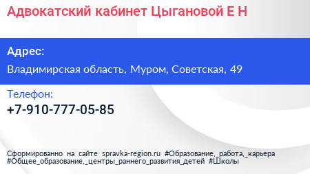 Адвокатский кабинет Цыгановой Е.Н. по адресу Владимирская область, Муром, Советская, 49 в дальнейшем Организация, размещена в следующих категориях: