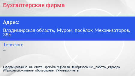 Бухгалтерская фирма по адресу Владимирская область, Муром, посёлок Механизаторов, 38Б в дальнейшем Организация, размещена в следующих категориях: