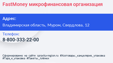 FastMoney, микрофинансовая организация по адресу Владимирская область, Муром, Свердлова, 12 в дальнейшем Организация, размещена в следующих категориях: