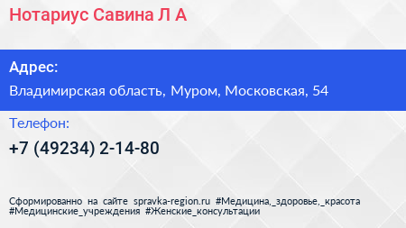 Нотариус Савина Л.А. по адресу Владимирская область, Муром, Московская, 54 в дальнейшем Организация, размещена в следующих категориях: