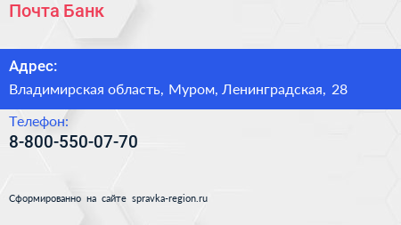 Почта Банк по адресу Владимирская область, Муром, Ленинградская, 28 в дальнейшем Организация, размещена в следующих категориях: