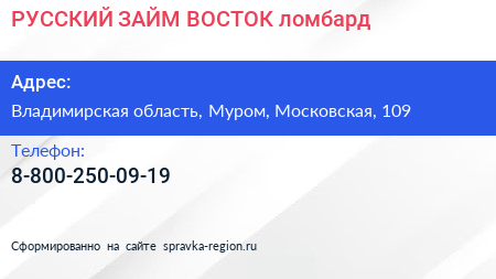 РУССКИЙ ЗАЙМ ВОСТОК, ломбард по адресу Владимирская область, Муром, Московская, 109 в дальнейшем Организация, размещена в следующих категориях: