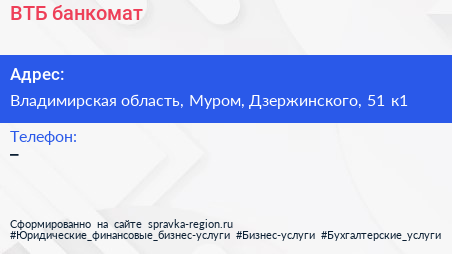 ВТБ, банкомат по адресу Владимирская область, Муром, Дзержинского, 51 к1 в дальнейшем Организация, размещена в следующих категориях: