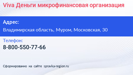 Viva Деньги, микрофинансовая организация по адресу Владимирская область, Муром, Московская, 30 в дальнейшем Организация, размещена в следующих категориях:
