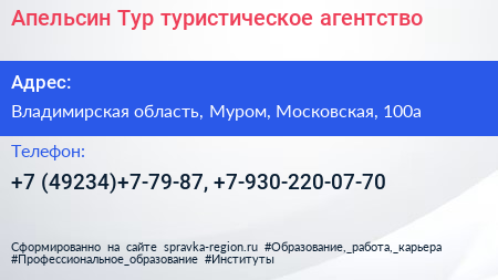 Апельсин Тур, туристическое агентство по адресу Владимирская область, Муром, Московская, 100а в дальнейшем Организация, размещена в следующих категориях: