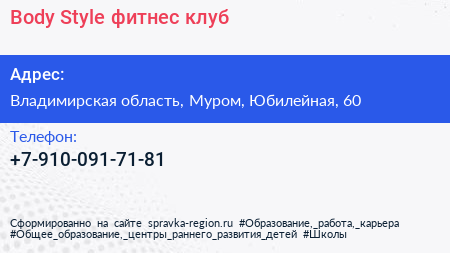 Body Style, фитнес-клуб по адресу Владимирская область, Муром, Юбилейная, 60 в дальнейшем Организация, размещена в следующих категориях: