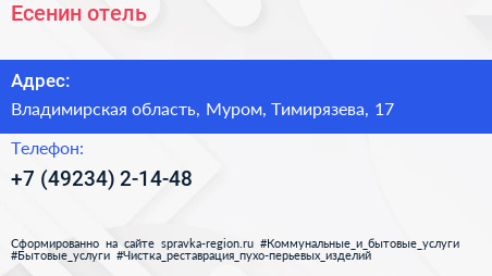 Есенин, отель по адресу Владимирская область, Муром, Тимирязева, 17 в дальнейшем Организация, размещена в следующих категориях: