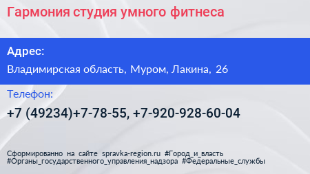 Гармония, студия умного фитнеса по адресу Владимирская область, Муром, Лакина, 26 в дальнейшем Организация, размещена в следующих категориях: