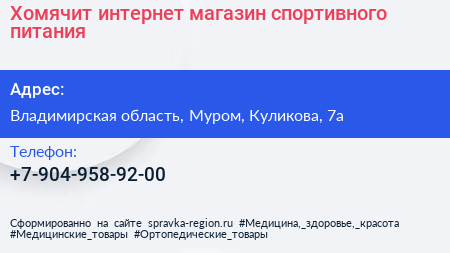 Хомячит, интернет-магазин спортивного питания по адресу Владимирская область, Муром, Куликова, 7а в дальнейшем Организация, размещена в следующих категориях: