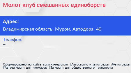 Молот, клуб смешанных единоборств по адресу Владимирская область, Муром, Автодора, 40 в дальнейшем Организация, размещена в следующих категориях: