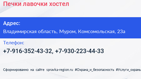 Печки-лавочки, хостел по адресу Владимирская область, Муром, Комсомольская, 23а в дальнейшем Организация, размещена в следующих категориях: