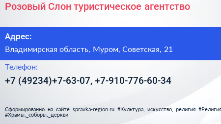 Розовый Слон, туристическое агентство по адресу Владимирская область, Муром, Советская, 21 в дальнейшем Организация, размещена в следующих категориях: