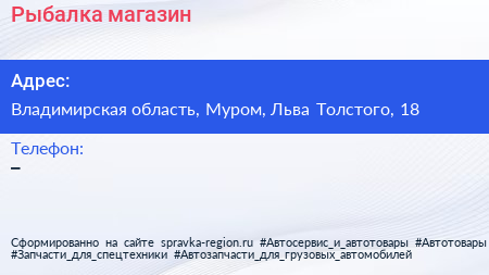 Рыбалка, магазин по адресу Владимирская область, Муром, Льва Толстого, 18 в дальнейшем Организация, размещена в следующих категориях: