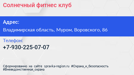 Солнечный, фитнес-клуб по адресу Владимирская область, Муром, Воровского, 86 в дальнейшем Организация, размещена в следующих категориях: