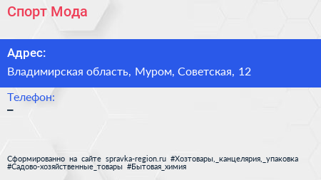 Спорт Мода по адресу Владимирская область, Муром, Советская, 12 в дальнейшем Организация, размещена в следующих категориях: