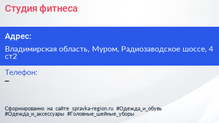 Студия фитнеса по адресу Владимирская область, Муром, Радиозаводское шоссе, 4 ст2 в дальнейшем Организация, размещена в следующих категориях: