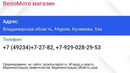 ВелоМото, магазин по адресу Владимирская область, Муром, Куликова, 16а в дальнейшем Организация, размещена в следующих категориях: