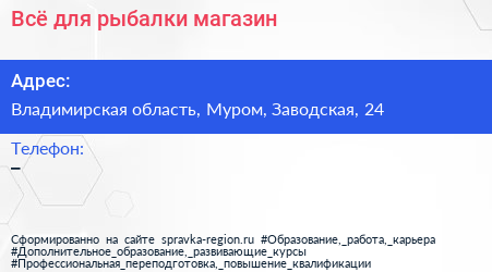 Всё для рыбалки, магазин по адресу Владимирская область, Муром, Заводская, 24 в дальнейшем Организация, размещена в следующих категориях: